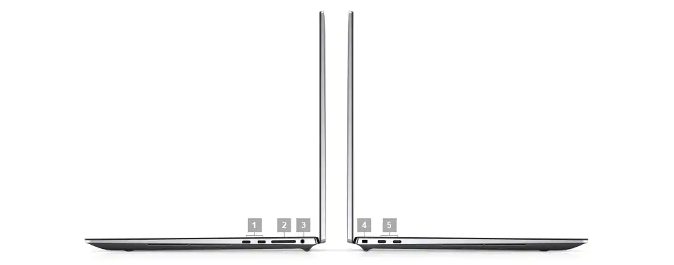1. 2 个 Thunderbolt 4.0 Type-C 端口 | 2. SD 卡读卡器插槽 | 3. 耳机插孔 | 4. 锁插槽 | 5. 2 个 Thunderbolt 4.0 Type-C 端口